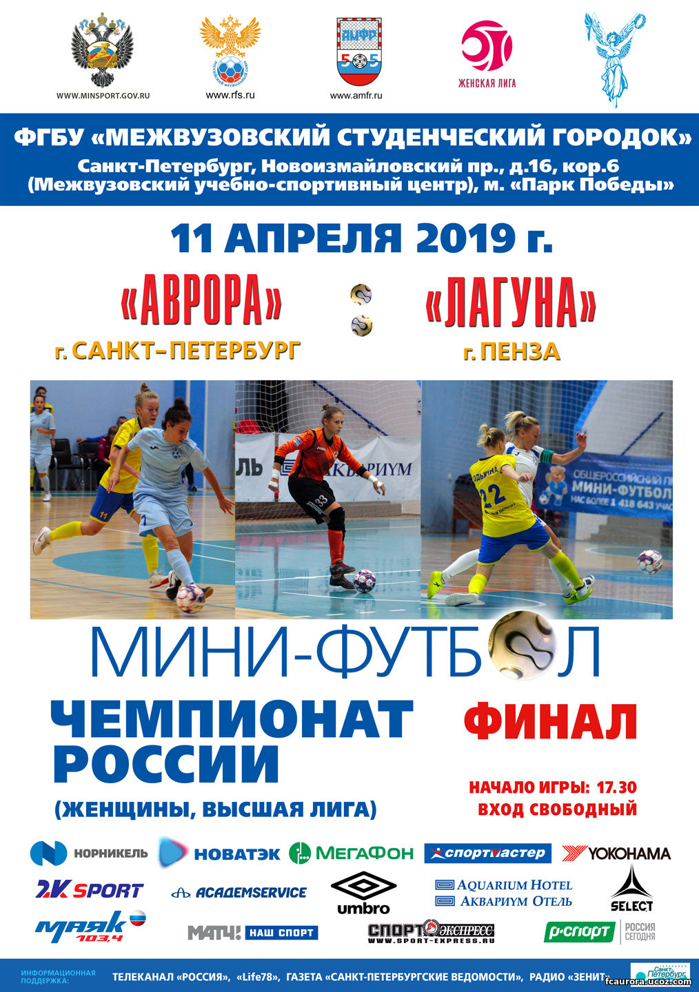 11 апреля в г. Санкт-Петербург пройдет ответный матч финала Чемпионата России по мини-футболу среди женских команд Высшей лиги! "Аврора" сыграет с "Лагуной" из Пензы. Первый матч закончился со счетом 4-3 в пользу "Лагуны".